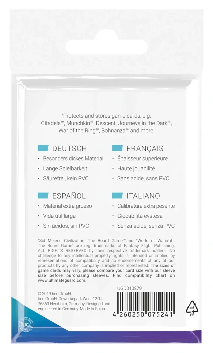 high quality sleeves for standard-sized American board game cards used in games like Citadels™, Munchkin™, Descent: Journeys in the Dark™, War of the Ring™, Bohnanza™, and more
